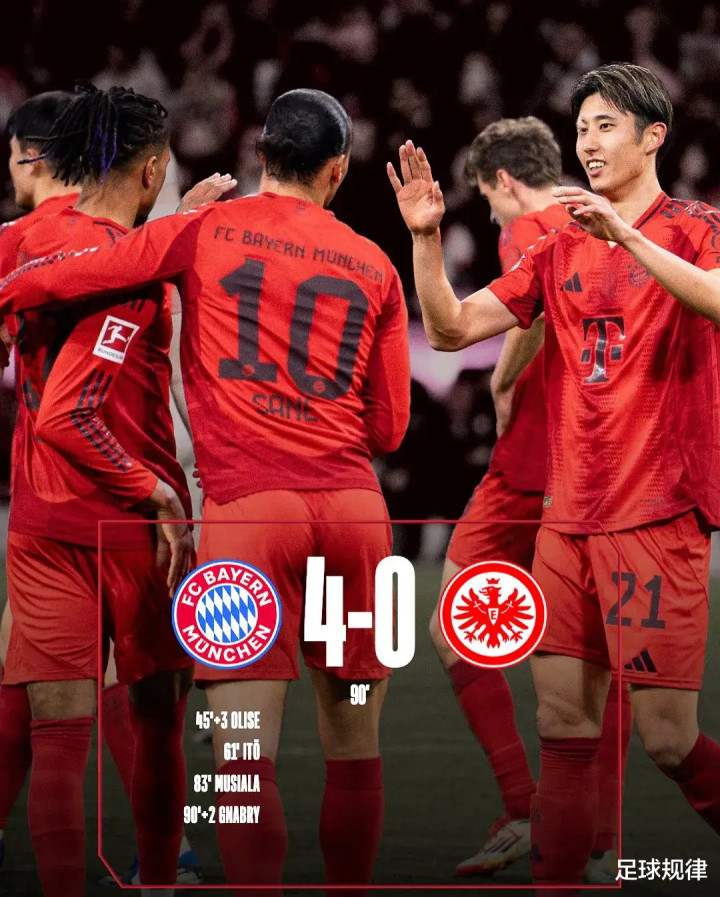 拜仁慕尼黑基米希缺席拜仁慕尼黑在上周的德甲联赛中主场4-0大胜排名第三的法兰克福取得主场十连胜,凯恩因伤坐在替补席上,老将托马斯穆勒首发登场。上半场结束前基米希因伤被格雷茨卡换下,上半场结束前萨内助攻奥利塞打破僵局。下半场拜仁慕尼黑获得角球,埋伏在门前的伊藤洋辉打入加盟后的处子球,他在客场击败凯尔特人的欧冠联赛中才第一次代表球队,上周只是他第三次出场。穆西亚拉随后展现天才般的表演打入第三球,替补登场的格纳布里打入第四球结束了进球盛宴。拜仁慕尼黑获胜后领先勒沃库森八分,联赛还剩十一场,重夺德甲冠军只是时间问题。